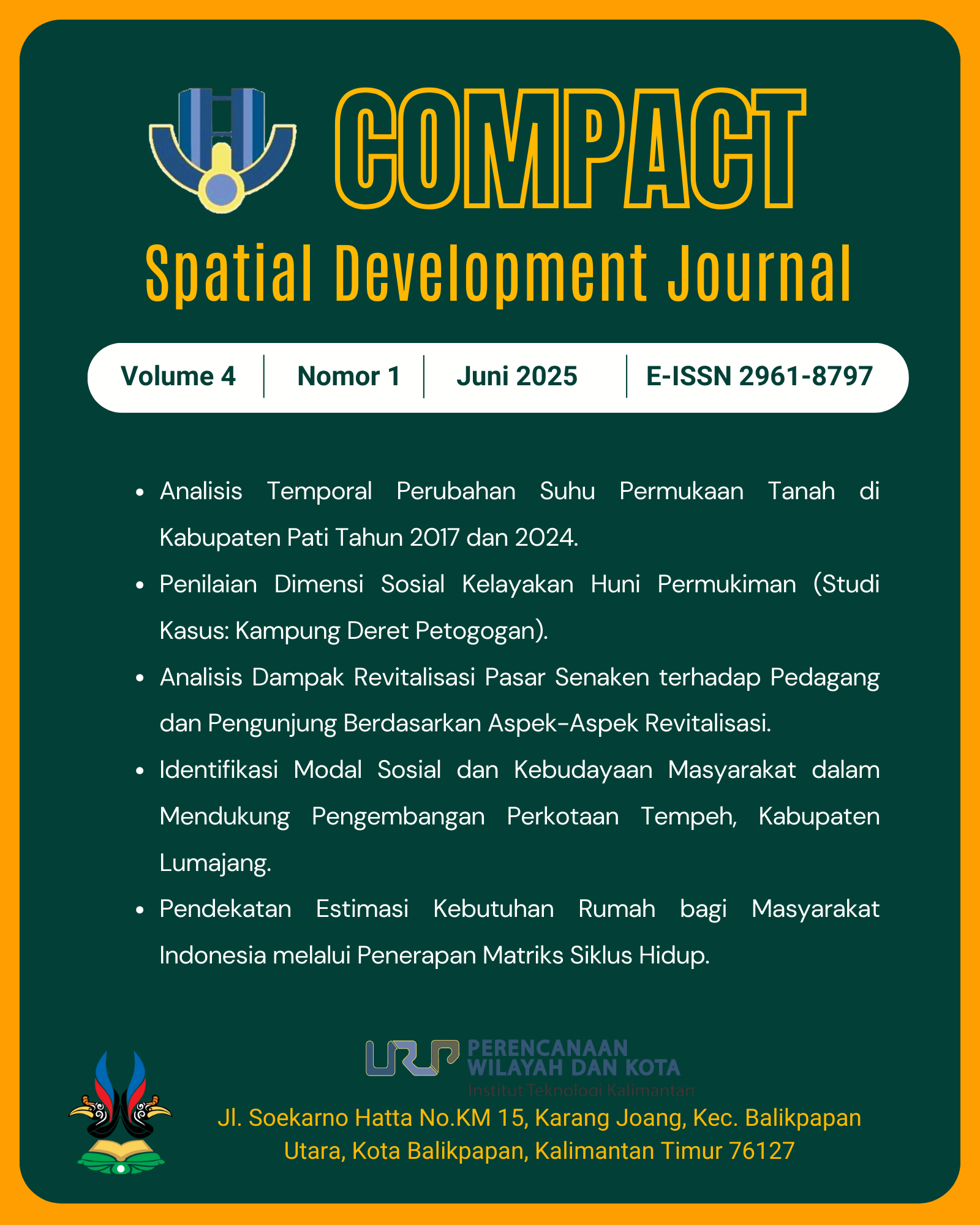 Vol 2 No 1 (2023)Edisi April 2023 Volume 2 Nomor 1 merupakan edisi spesial dengan menerbitkan paper atau artikel yang telah direview dan dipresentasikan pada Seminar Nasional COMPACT yang diadakan 19 Oktober 2022 di Kampus Institut Teknologi Kalimantan. Penyelenggara merupakan Program Studi Perencanaan Wilayah dan Kota. Sebanyak 17 artikel dari seminar diterbitkan pada Jurnal Compact yang telah direview oleh reviewer seminar, dan 2 artikel reguler.