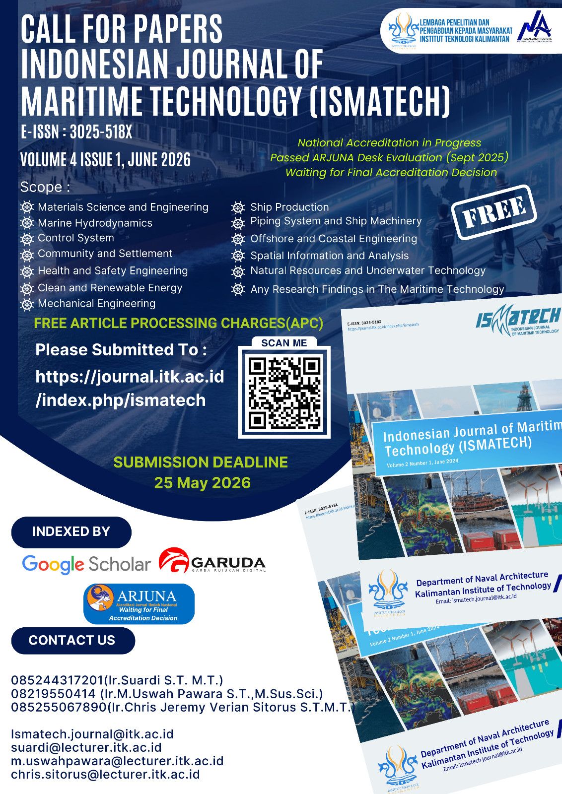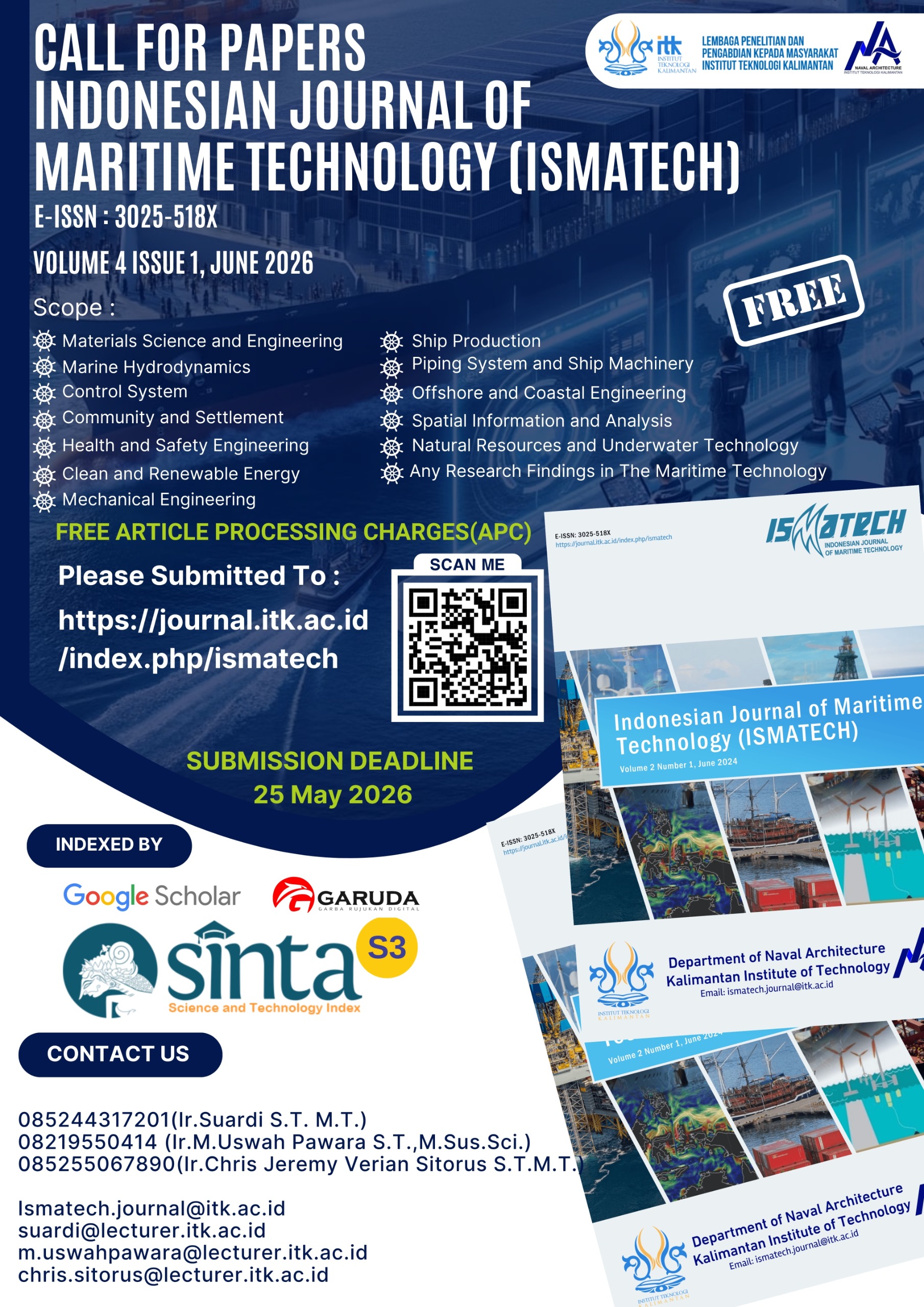 The Indonesian Journal of Maritime Technology (ISMATECH) was established in 2023 in response to the growing need for a dedicated scholarly platform that accommodates academic publications in the fields of maritime science and marine technology. The journal was initiated by academics and professionals who recognized the strategic importance of advancing scientific research in areas such as Naval Architecture, Ocean Engineering, Marine Engineering, and Mechanical Engineering with maritime applications, along with other related disciplines including marine and fisheries science, renewable and ocean energy, electrical engineering, materials and metallurgical engineering, environmental engineering, and other interdisciplinary fields that support the development of maritime science and technology.