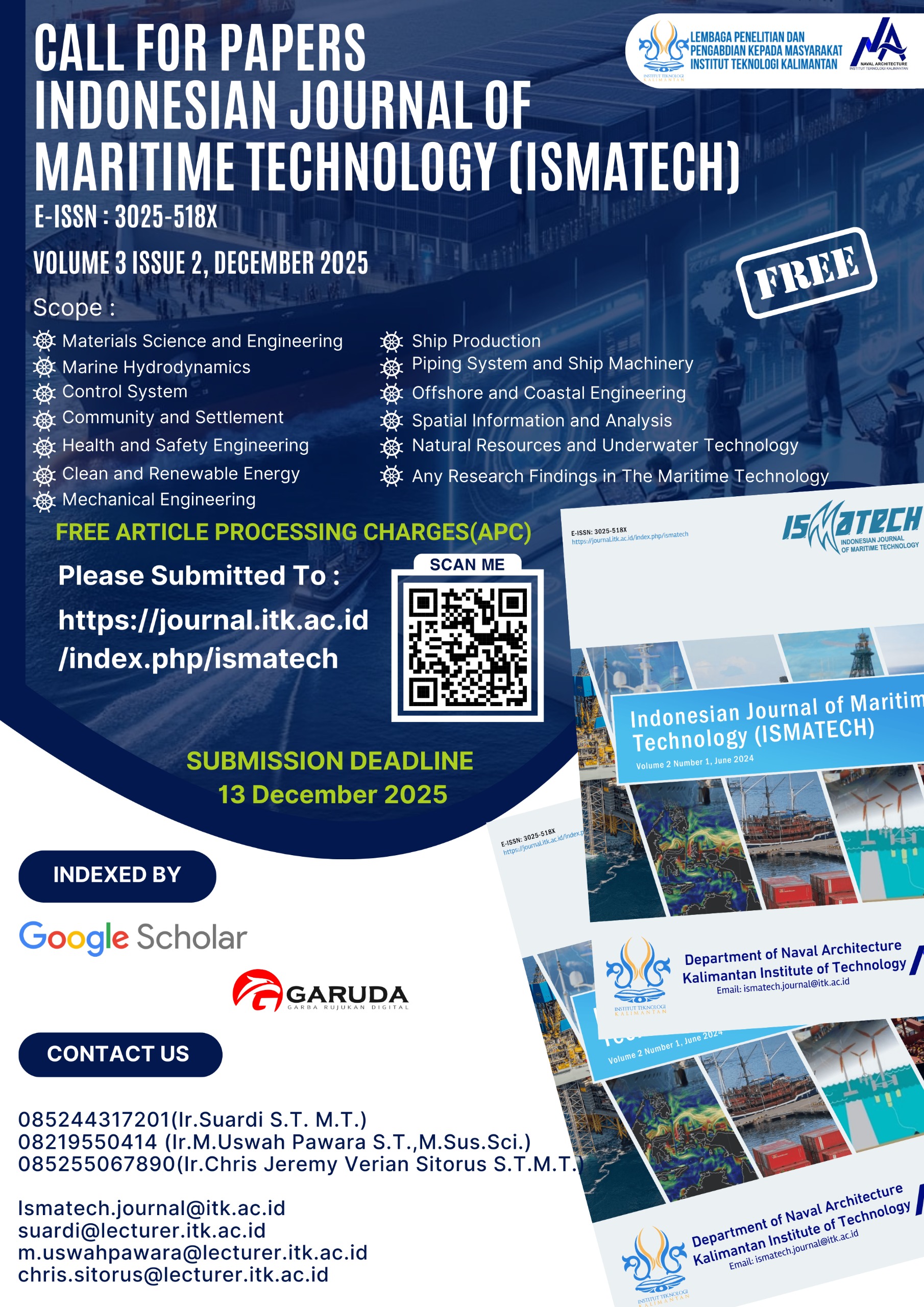 The Indonesian Journal of Maritime Technology (ISMATECH) is a scientific, peer-reviewed journal committed to publishing high-quality research in the field of maritime science and technology. The journal is dedicated to advancing knowledge and innovation in key disciplines such as Naval Architecture, Ocean Engineering, Marine Engineering, and Mechanical Engineering, with particular interest in areas like engine performance, renewable and alternative energy sources, solar panel applications, Computational Fluid Dynamics (CFD), Finite Element Method (FEM), and other maritime-related technologies.